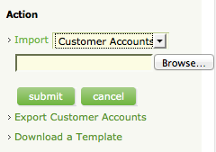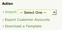 Importing the upload template is easy. Just navigate to the Customer Accounts area of Z-Billing and in the Action area you'll find an Import option with a dropdown menu. Select Customer Accounts